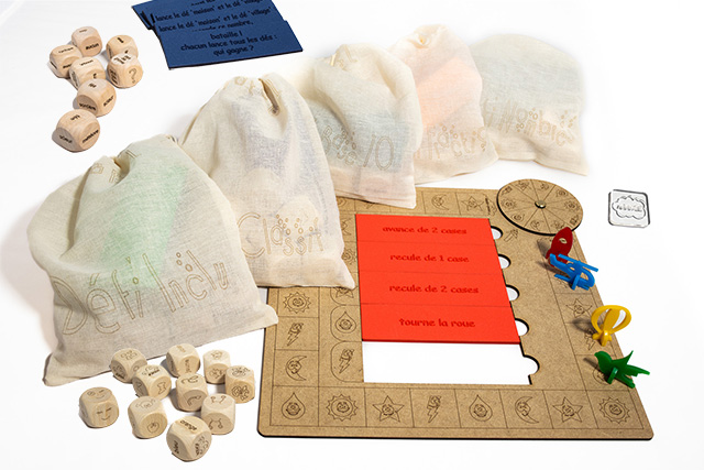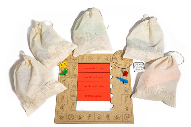 Plateau en bois épaisseur 3 mm, cartes actions en EVA souple 3 mm, pions et repère en acrylique, dés en bois.