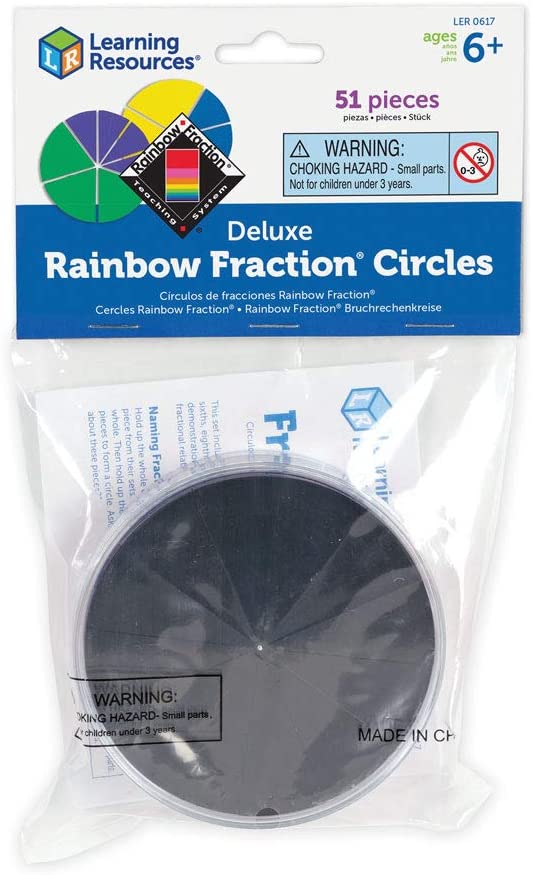 Ce kit de chez Learning Ressources est composé de 9 cercles en plastique découpés en fractions aux couleurs de l'arc-en-ciel, d'un support et d'une boîte de rangement.