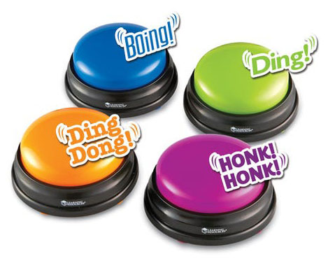 Buzzer de chez Learning Ressources de 9cm de diamètre, piles (2xAAA) non fournies.