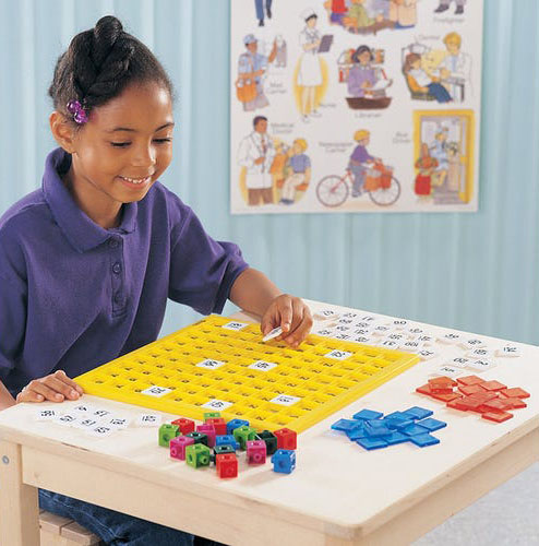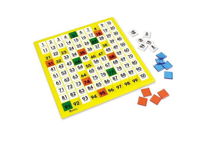 Planche de 0 à 100 de chez Learning Ressources, de 30 cm de côté. Le tableau recto verso comprend des cases avec des nombres imprimés d’un côté et une grille de l’autre. sont également fournis :