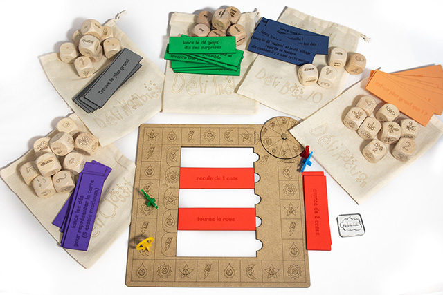 Plateau en bois épaisseur 3 mm, cartes actions en EVA souple 3 mm, pions et repère en acrylique, dés en bois.