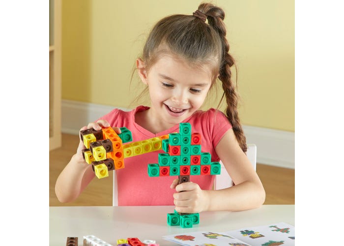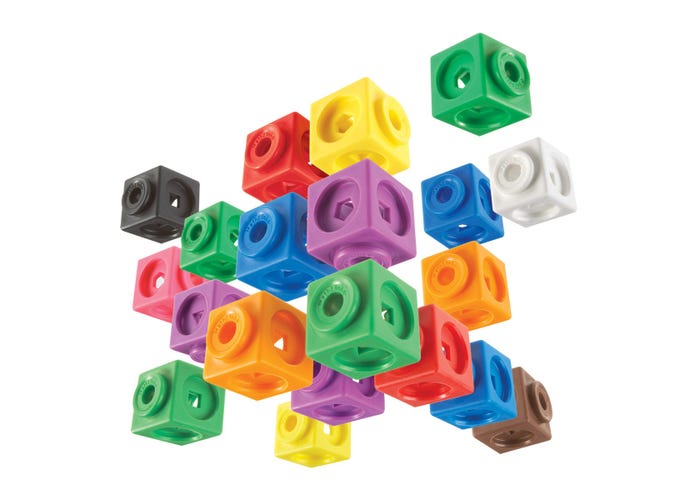 Cette boîte de chez Learning Ressources (Mathlink) comprend 200 cubes de couleur emboîtables de grande taille (2cm de côté) ainsi qu'un manuel avec des modèles à construire.