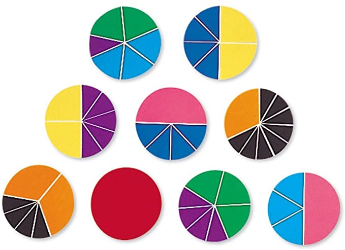 Ce kit de chez Learning Ressources est composé de 9 cercles en plastique découpés en fractions aux couleurs de l'arc-en-ciel, d'un support et d'une boîte de rangement.