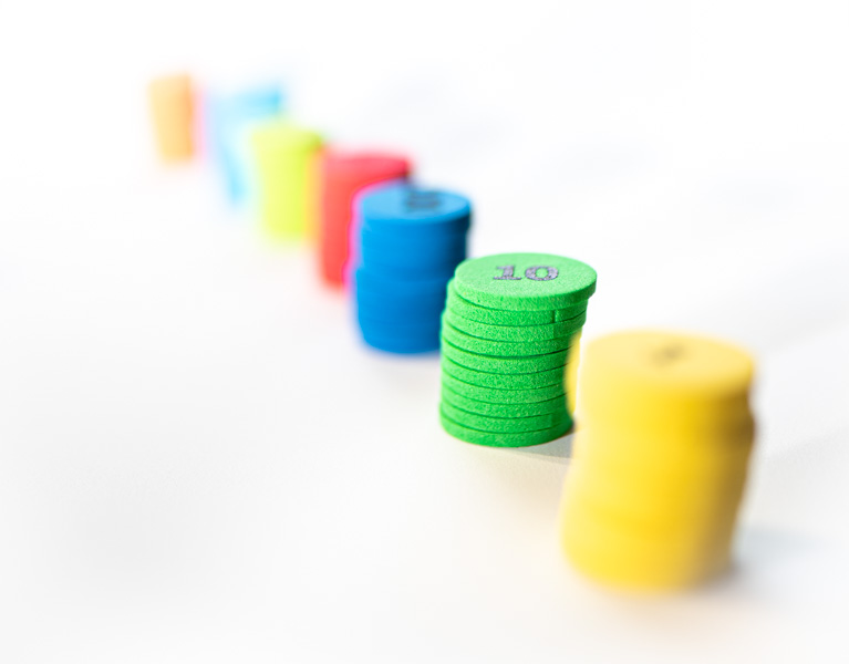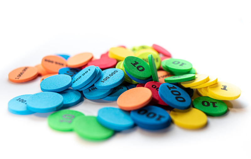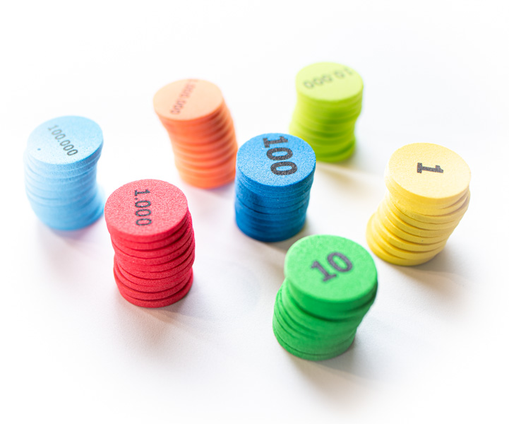 Ce kit de chez Learning Ressources est composé de jetons de valeurs de 1 à 1 million : 40 jetons de chaque valeur, soit 280 jetons.