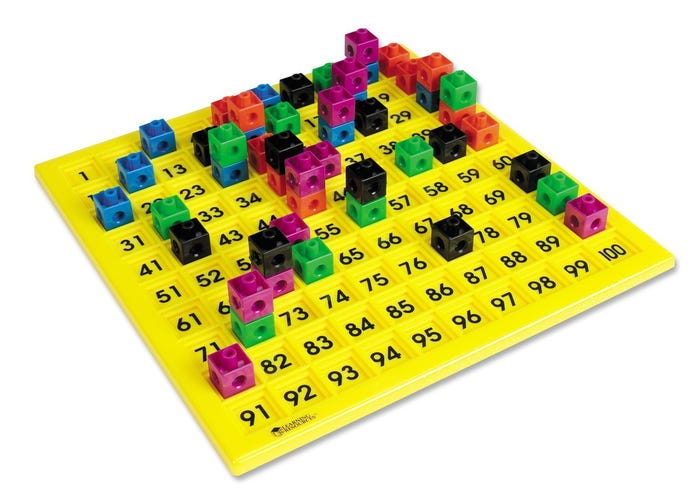 Planche de 0 à 100 de chez Learning Ressources, de 30 cm de côté. Le tableau recto verso comprend des cases avec des nombres imprimés d’un côté et une grille de l’autre. sont également fournis :